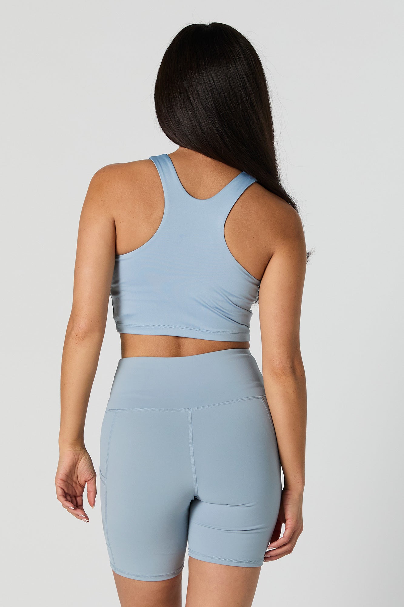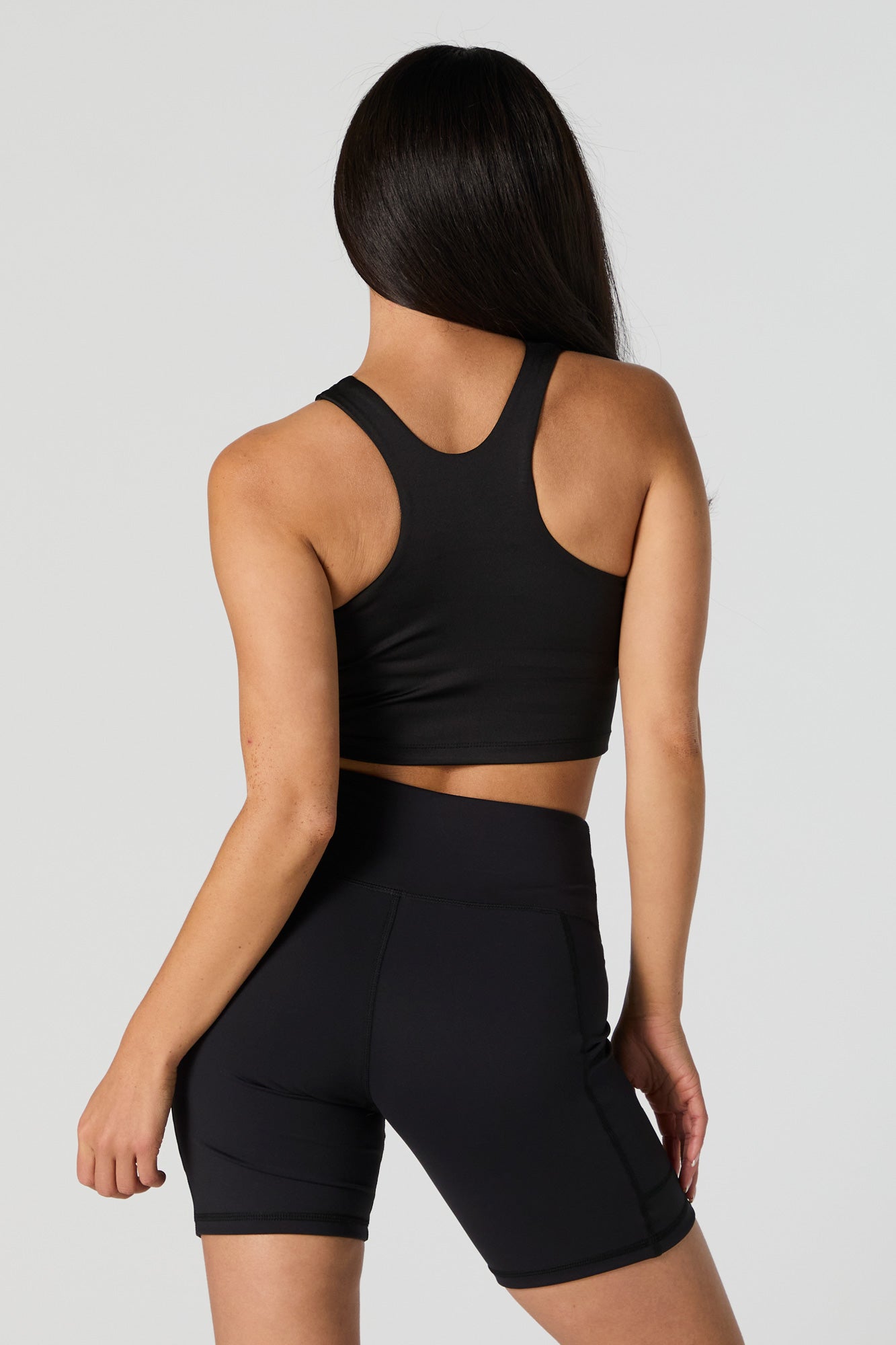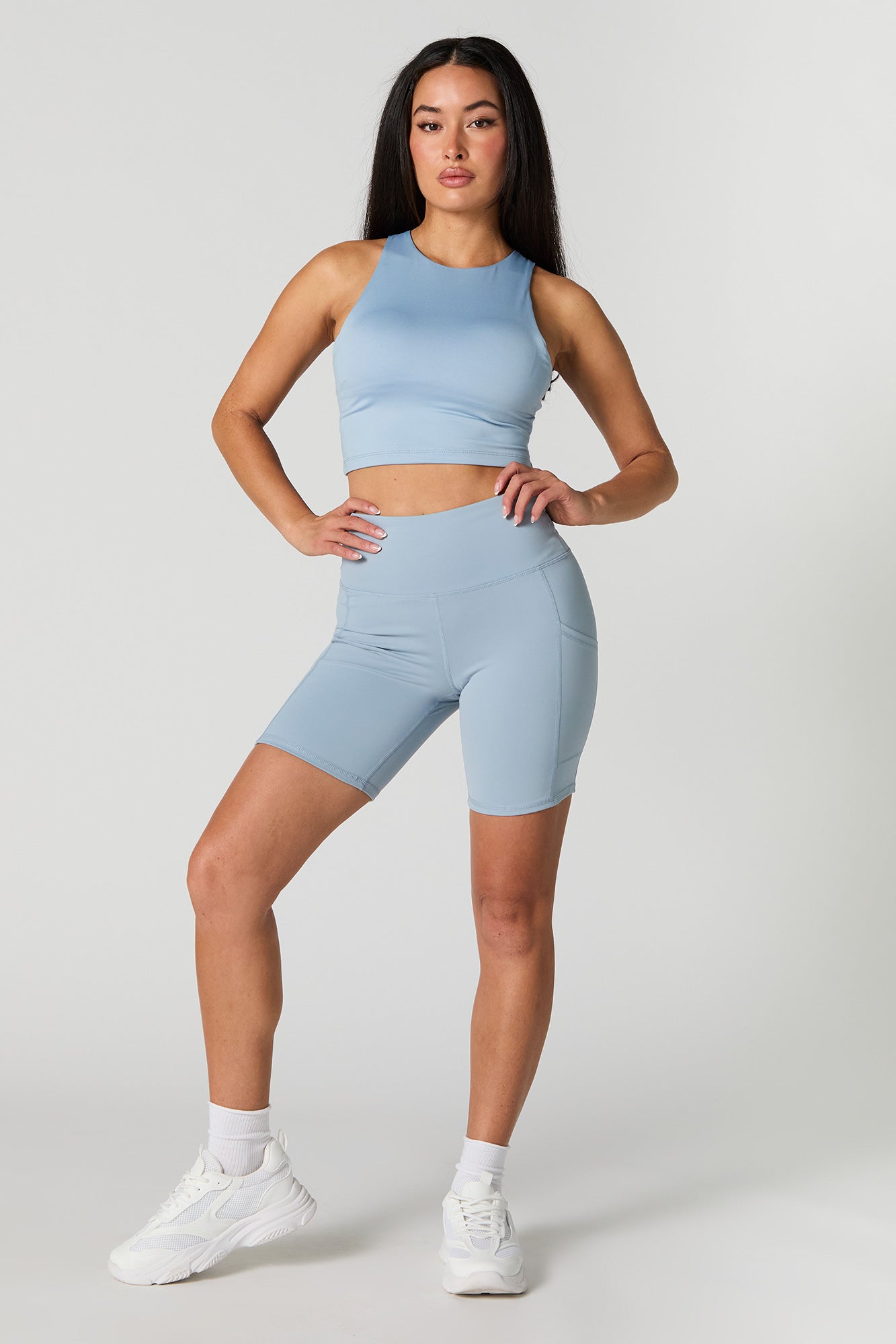 This tank features crew neckline, sleeveless, built-in bra cups and cropped hem. Complete the look with the High Rise Side Pocket Active Short.