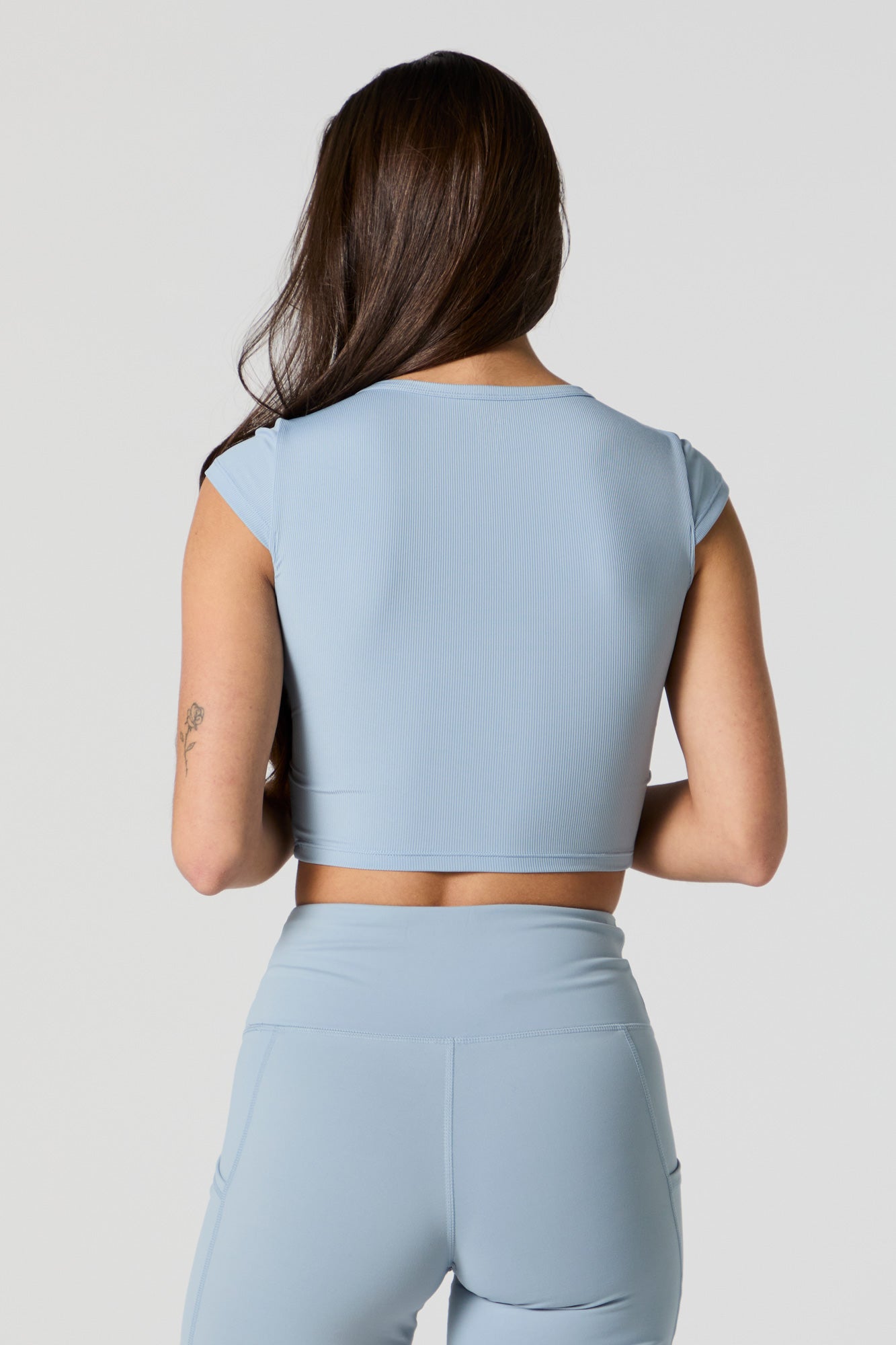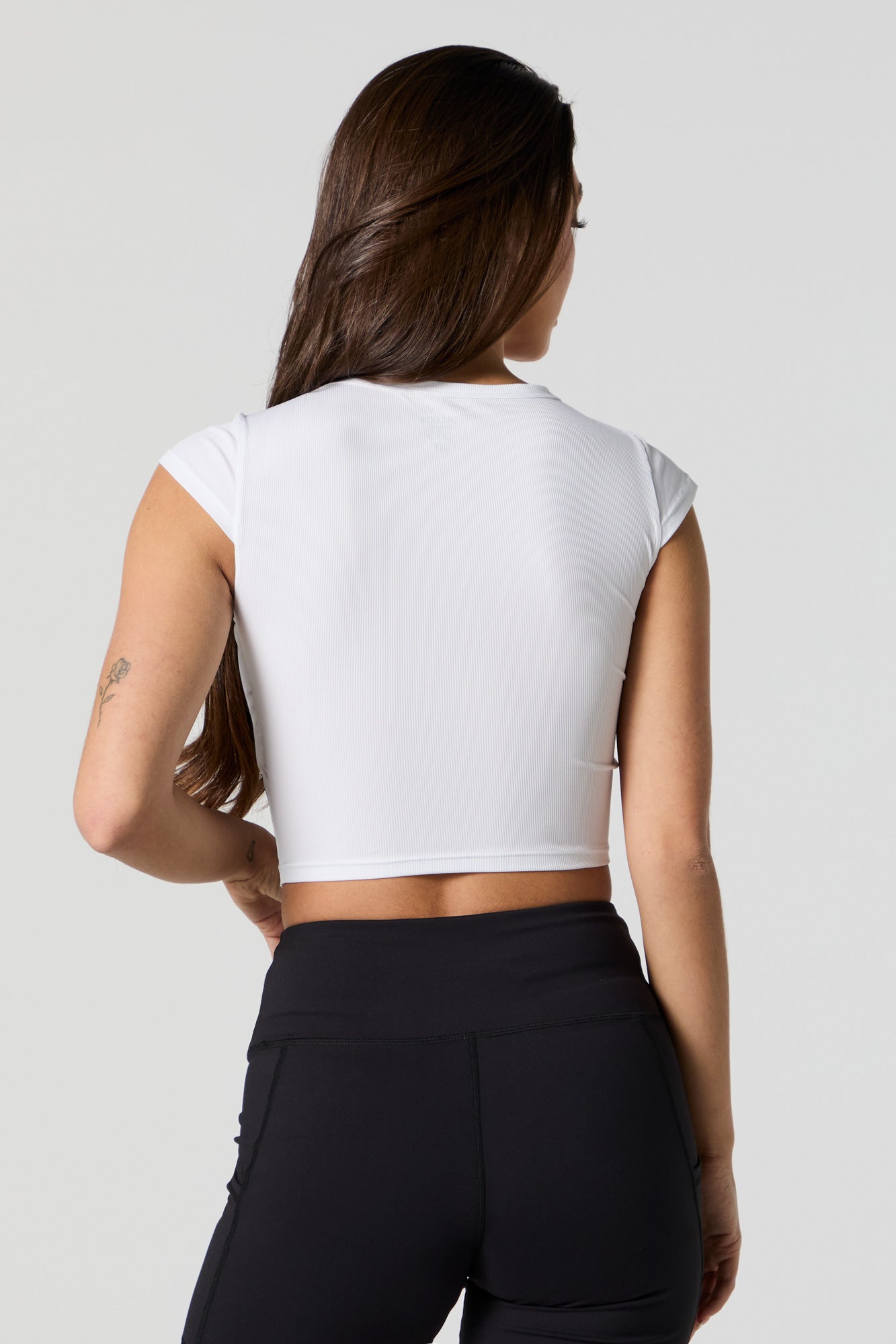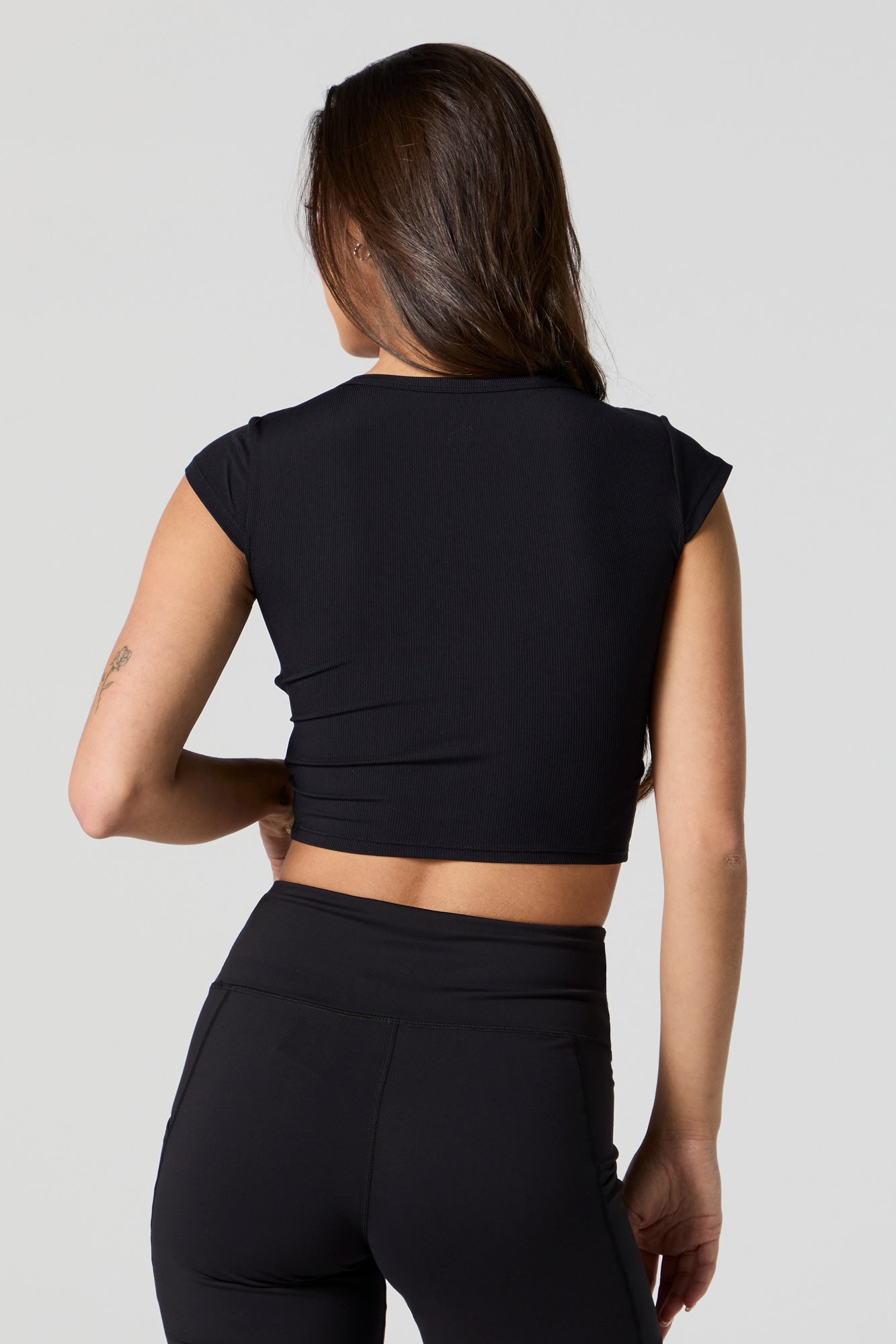 This top features all-over ribbing, short sleeves, built-in bra cups, cinched front and cropped hem.