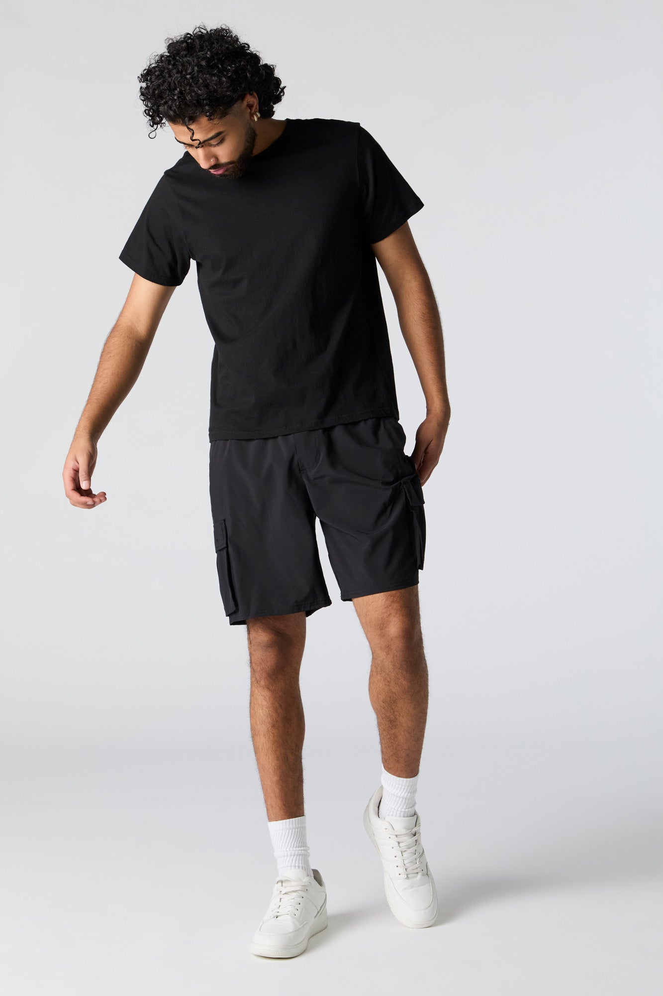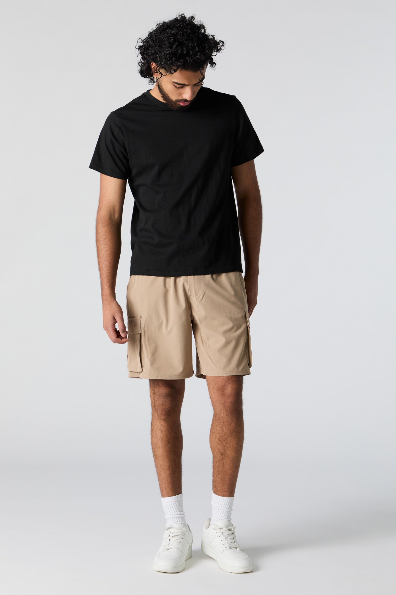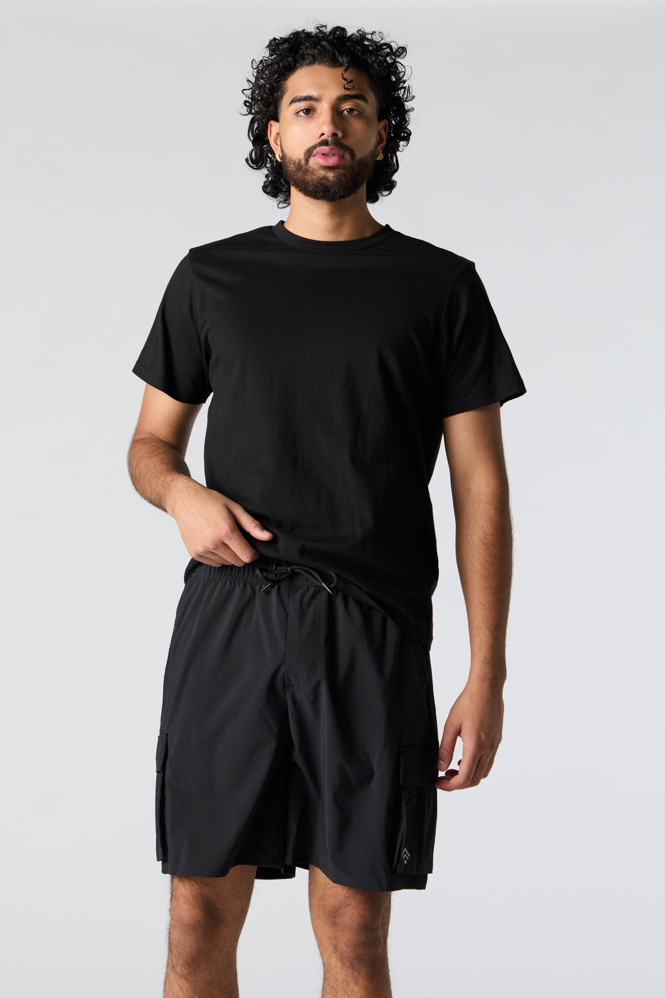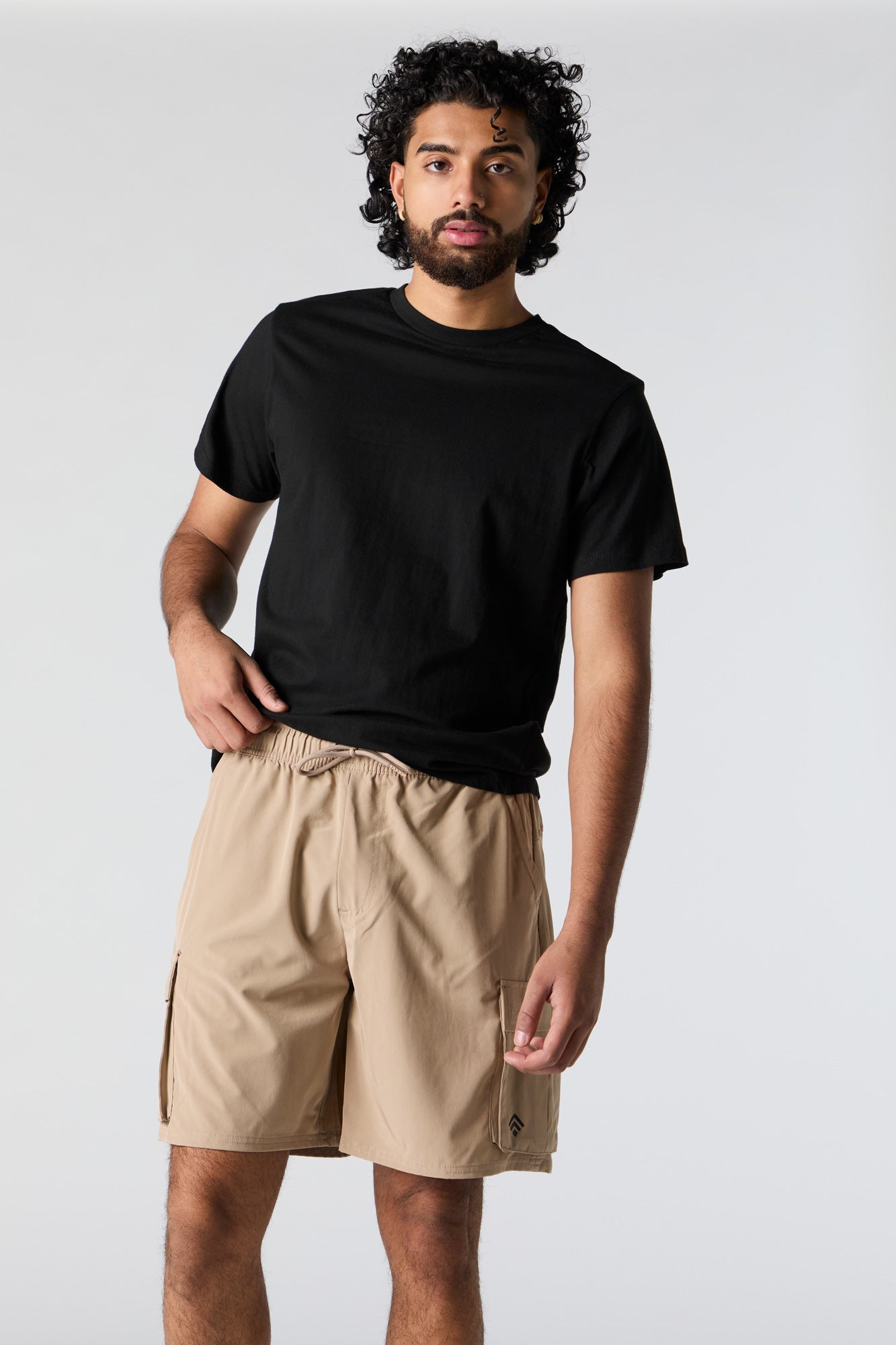 Stay active and stylish all season long in our 4-way-stretch activewear. This short features 4-way-stretch material, drawstring waist, slide-in pockets, cargo pockets.